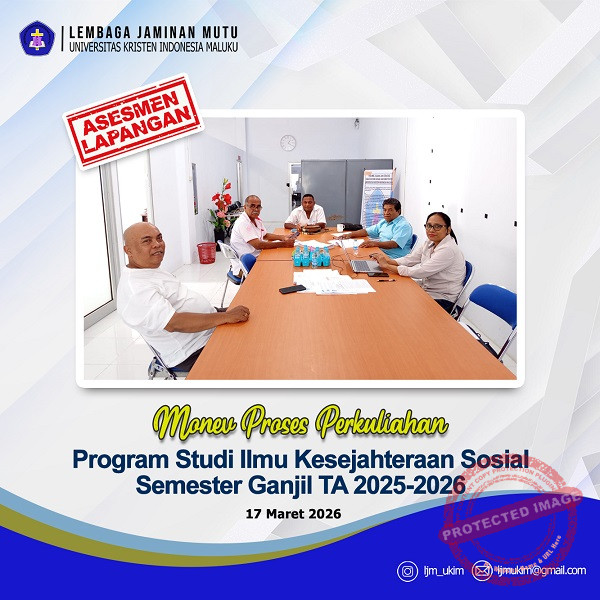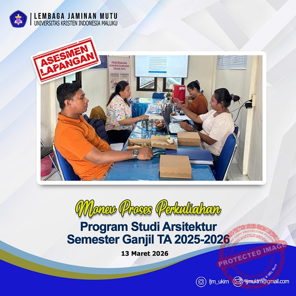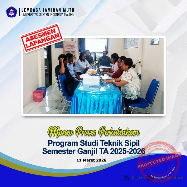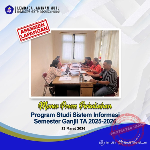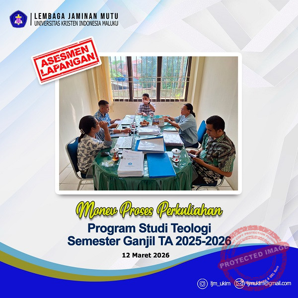 Lembaga Jaminan Mutu Universitas Kristen Indonesia Maluku melaksanakan asesmen hasil monitoring dan evaluasi semesteran terhadap proses pembelajaran untuk semester Ganjil Tahun Akademik 2025/2026 di 18 Program Studi dalam linkup UKIM yang dimulai pada tanggal 09 Maret 2026 dan berakhir pada 09 April 2026.